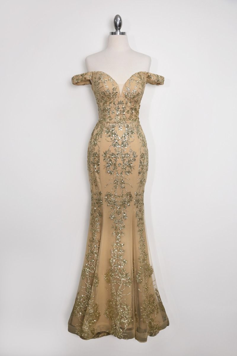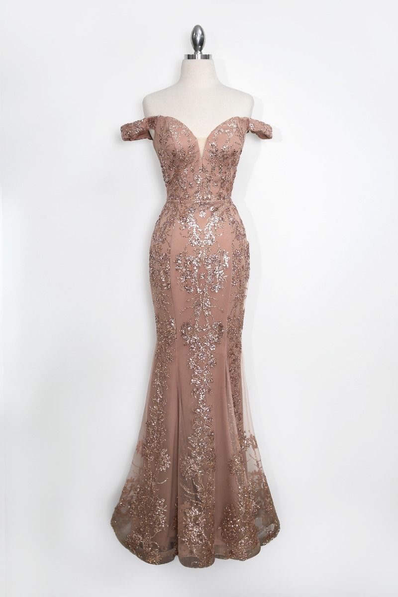 This fitted gown captivates with a luxurious blend of glamour and structure. Designed with an off-the-shoulder neckline and plunging illusion corset bodice, it enhances your shape with a sculpted silhouette that flares softly into a sweep train. The sequin lace fabric glistens with every movement, while a back zipper closure ensures easy and secure wear. Ideal for black-tie events, formal galas, or prom nights where elegance is essential.